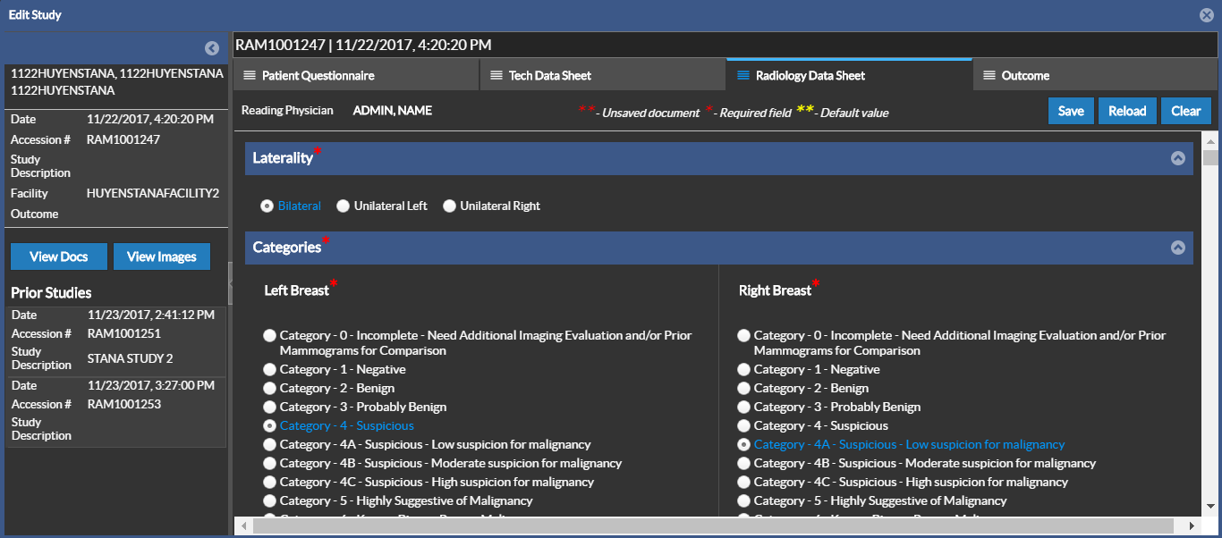 The Edit Study screen displays the datasheet based on the role of the user accessing the study. In this example, the Radiology Data Sheet is displayed since a radiologist is viewing the study.