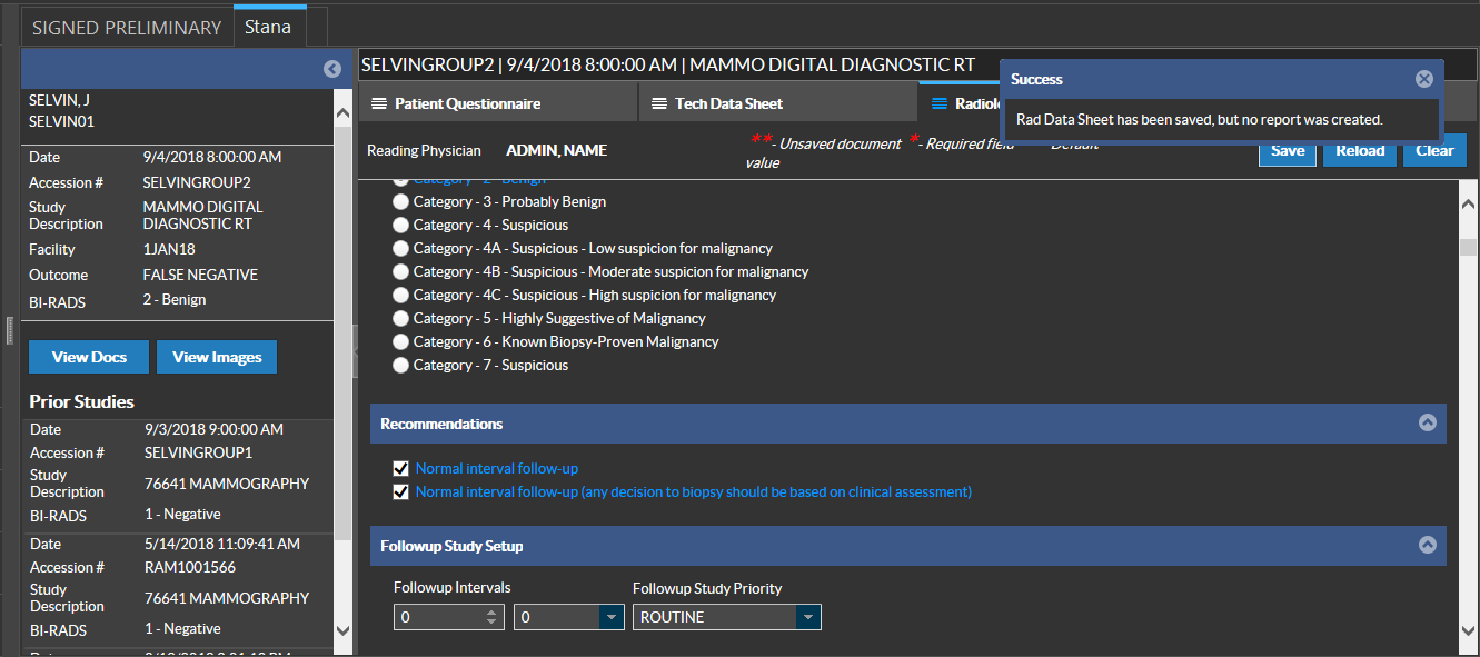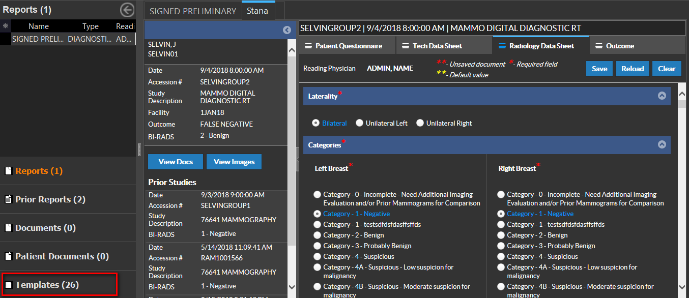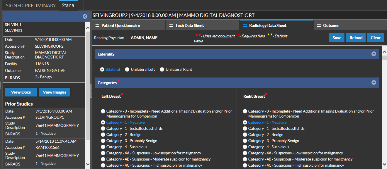 The Stana diagnostic report for a Breast Imaging Study is like any diagnostic report that gets generated in the Document Viewer. Create, update, sign and amend this report like any other document in the Document Viewer.