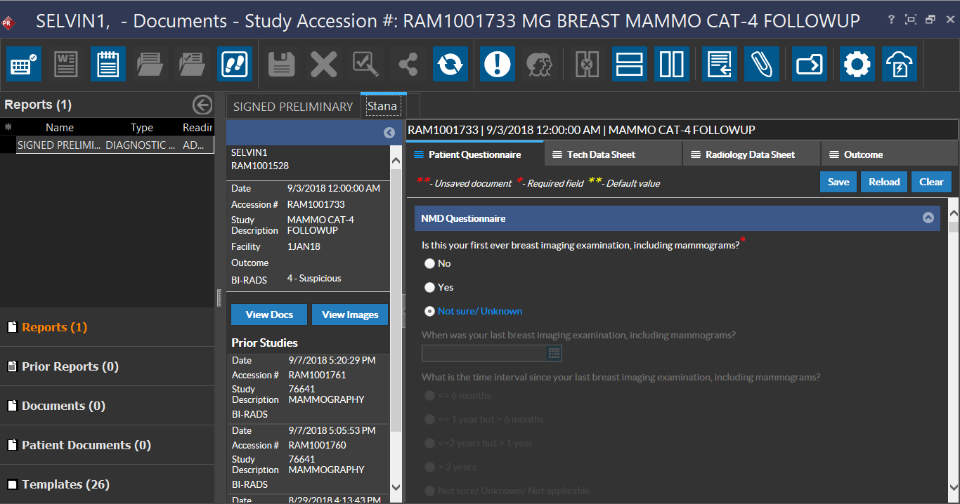 Alternatively, open Document Viewer for a Breast Imaging study by clicking the Documents icon on the Worklist. The Document Viewer opens up, displaying existing reports (if any). If there are no existing reports or documents, the Stana tab opens up displaying the Radiology Data Sheet by default.