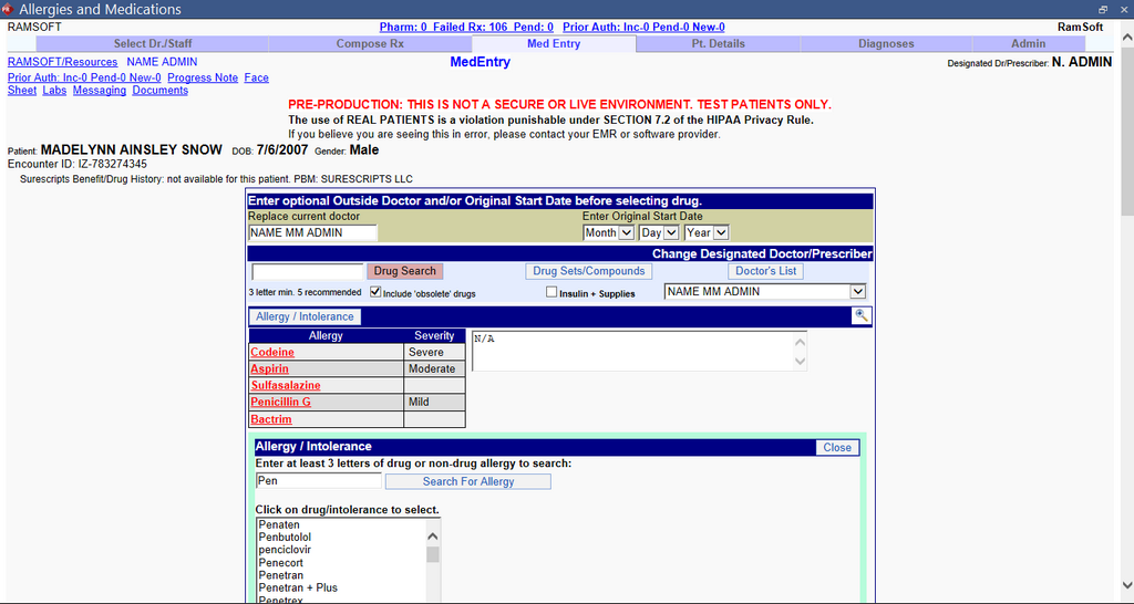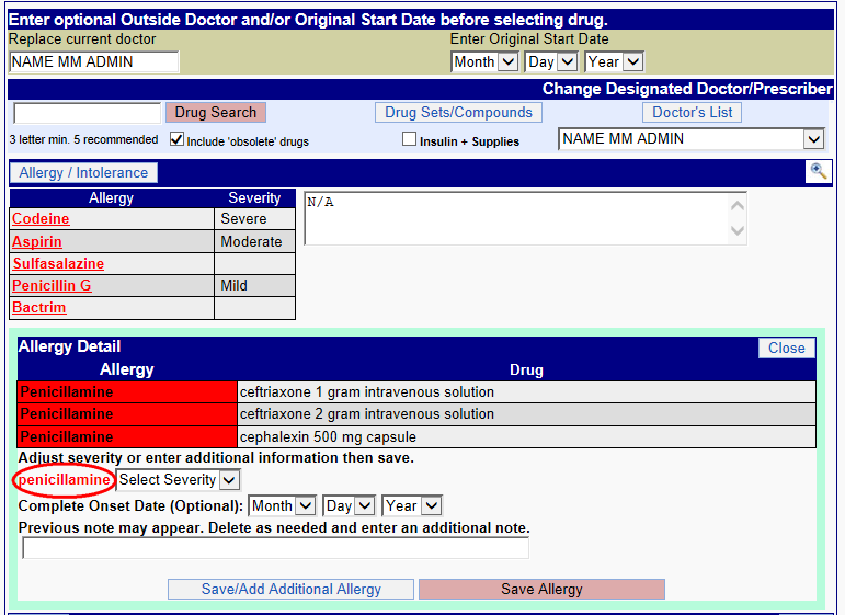 For example, let us consider "Pen" as first three characters/letters of the allergy. Type "Pen" in the text field and click the Search For Allergy button. The Newcrop interface will show you all allergy names starting with "Pen" as shown below.