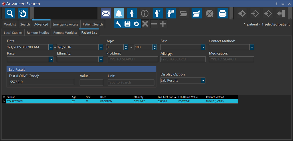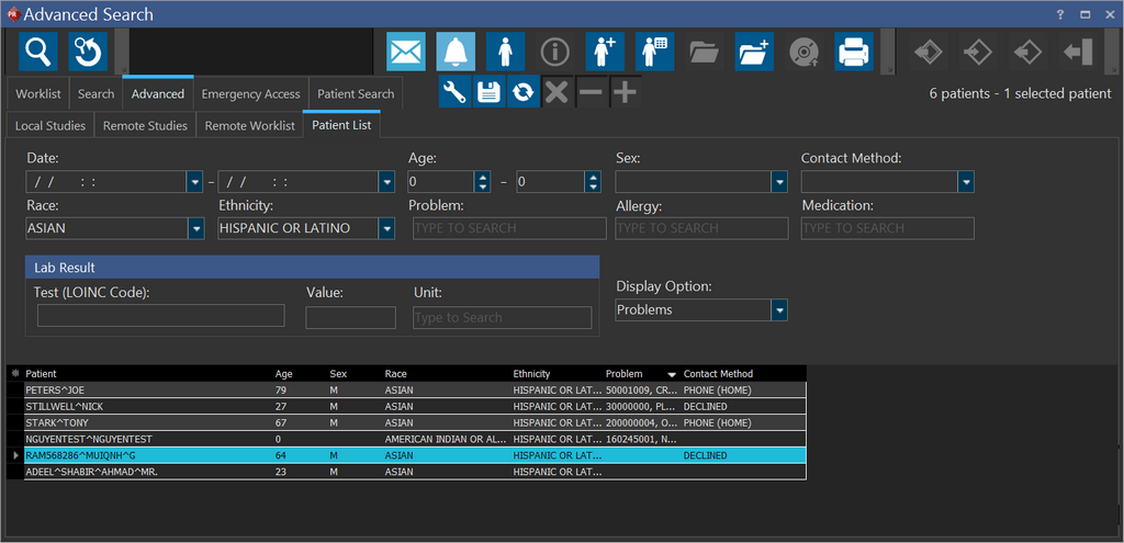 Note that the Display Options menu controls what gets displayed in the result. For example, when you want to retrieve the list of patients with a specific problem, you need to ensure that the Display option field is set to Problems. If this is not the case, the result displayed would be controlled by the existing display option selected.