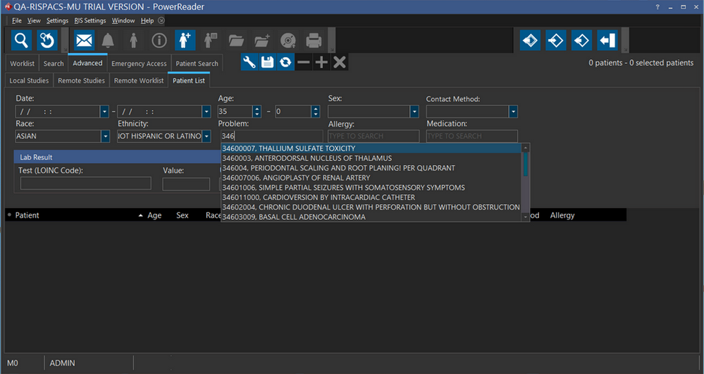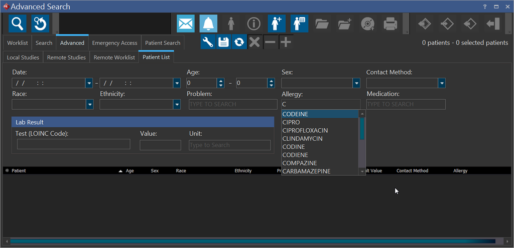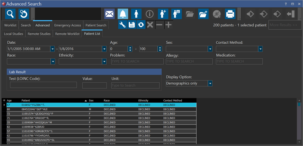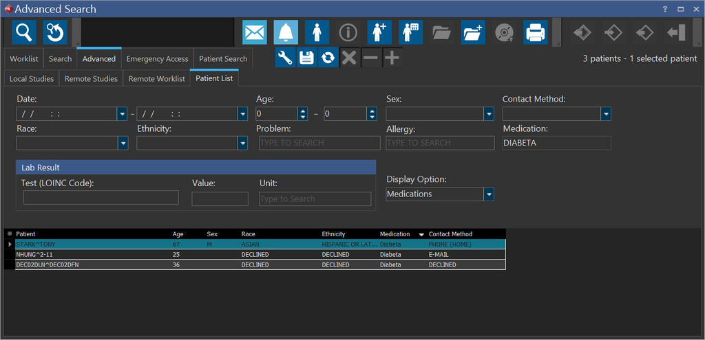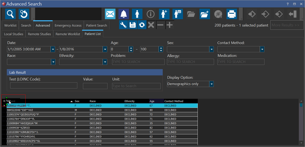 The Age field is used to enter the age of the patient at the time of the study. It is chosen as (Study Date - Patient Date of Birth). For example, entering the range of age between 1 and 16 displays all patients between the age of one and sixteen at the time of the study. The other search criteria are from the Patient Info form i.e. Sex, Race, Ethnicity, Allergy, and Medication.