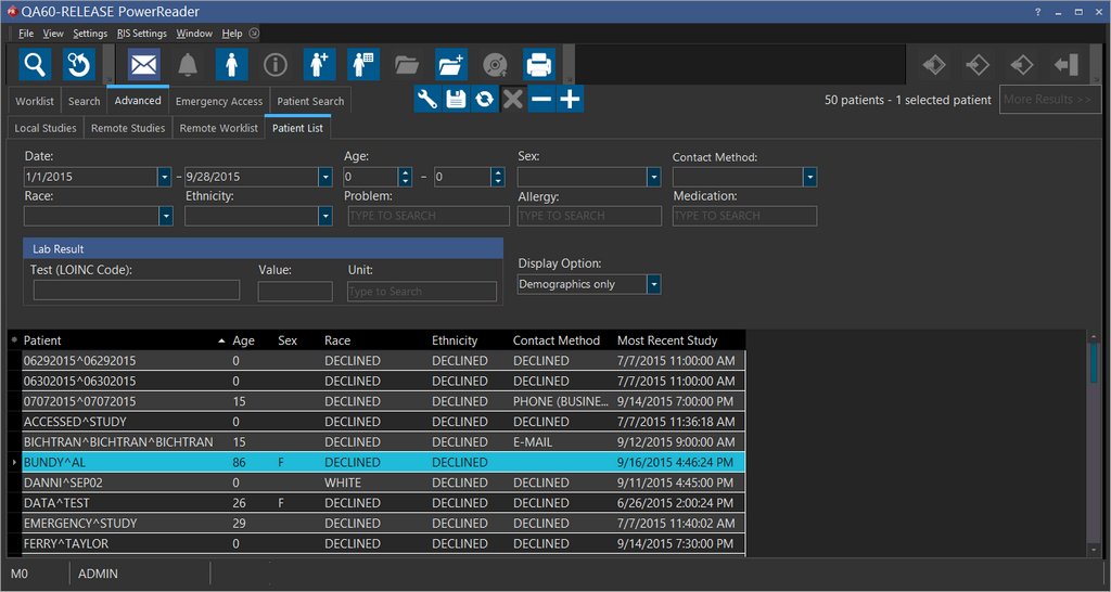 A list of patients can be generated that fulfills various criteria. The Patient List tab is accessed from the search screen via Advanced > Patient List tab. The patient list tab displays a list of patients previously searched for a specific date range.