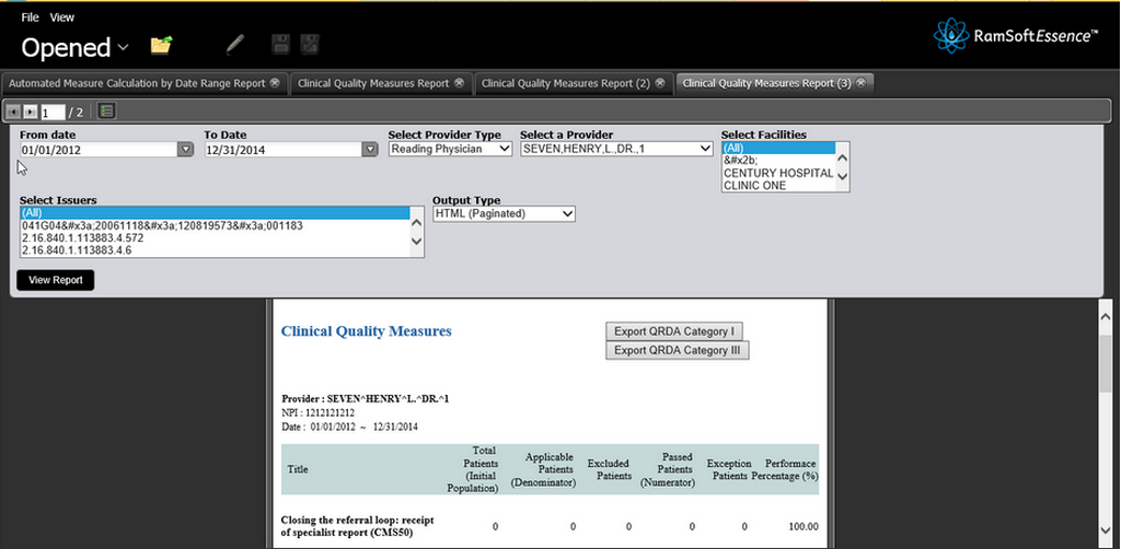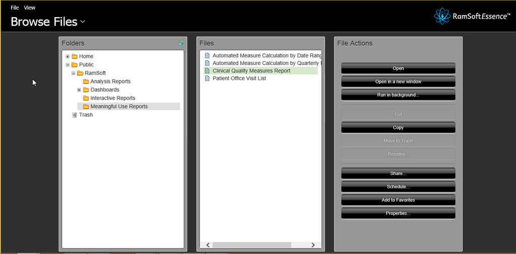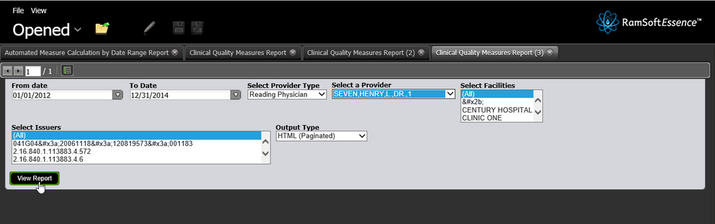 Reports for Clinical Quality measures is a part of the Meaningful Use Criteria and must be reported by the user to the CMS. The measures are explained in detail in the Center for Medicare and Medicaid Services website https://www.cms.gov/.The report can be generated by clicking Browse Files > RamSoft > Meaningful Use Reports and selecting Clinical Quality Measures Report file in the RamSoft Essence page.