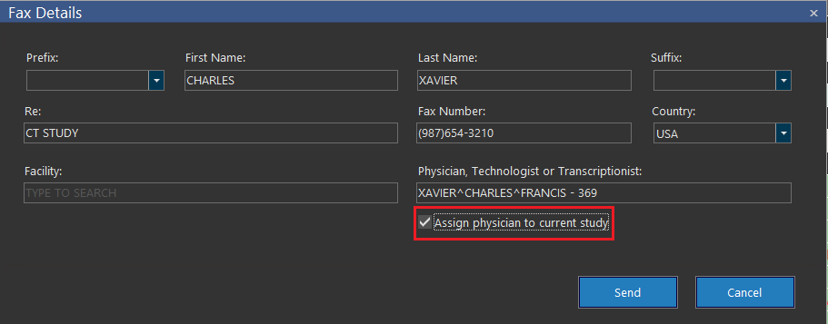 The Assign physician to current study option is available to assign the physician as a consulting physician. The checkbox should be enabled if the physician entered in the Physician, Technologist or Transcriptionist field is a Referring Physician.