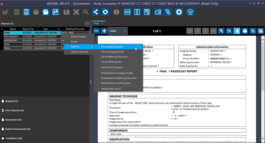- Fax to New Recipient, Imaging Facility, Referring Physician or all existing Recipients