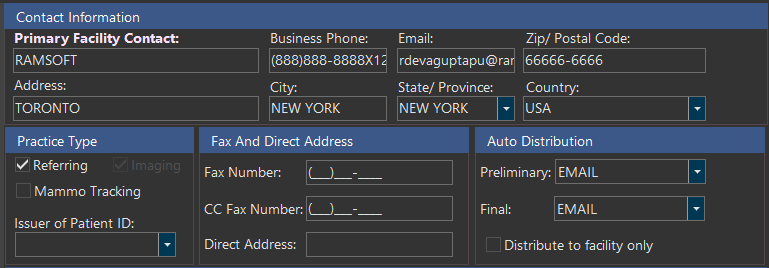To set the contact information for an imaging facility, go to Users and Facilities > Imaging Facilities, and select the desired facility. Here, the facility's Email and Fax Number can be entered. A Distribution section contains settings for Auto Fax, Auto Email, and Auto Export and Direct message. These are activated when one of the distribution options is selected.