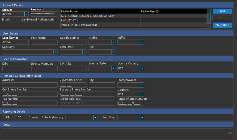If the option has been disabled for any specific reason, it will be stated below the Physician, Technologist or Transcriptionist field in blue.