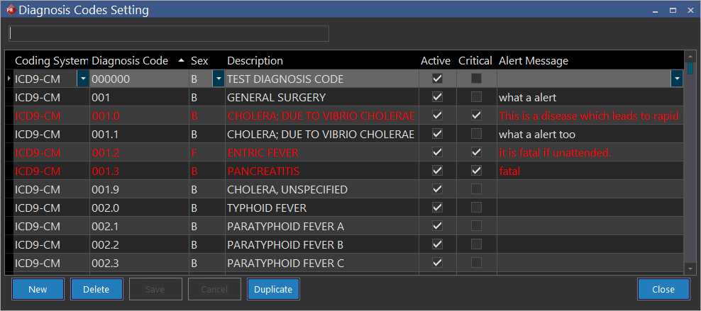 Existing codes can be filtered by entering the description or the diagnosis code number in the search window.