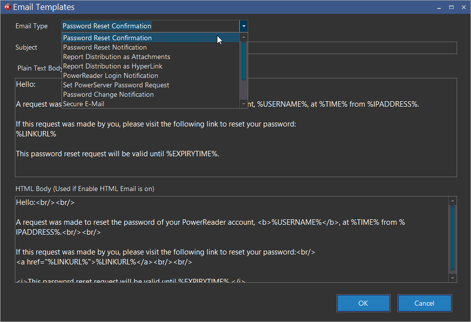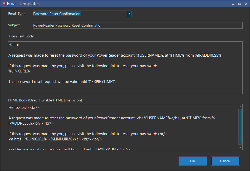 | %LINKURL% | The URL of the PowerReader password page. This will take the user to a page where the user can change/retrieve password (if forgotten) |