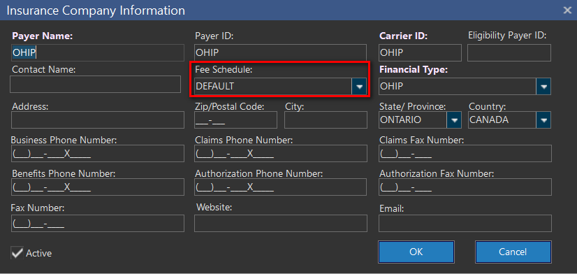 Choose a Fee Schedule to assign to the Insurance Payer in the Fee Schedule dropdown. The dropdown list contains available currently Active, non-expired fee schedules.