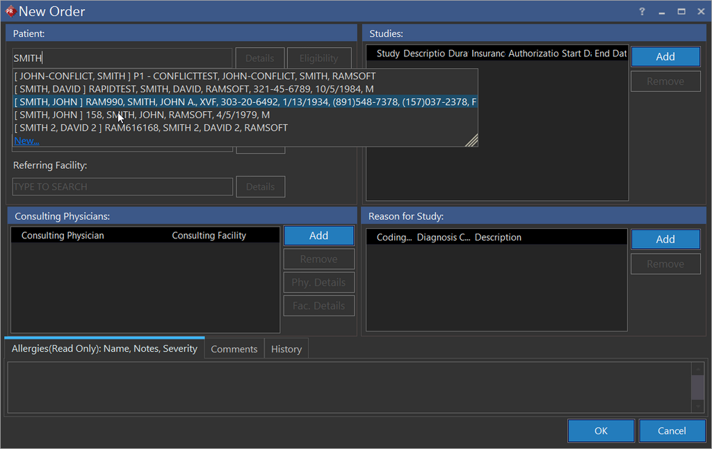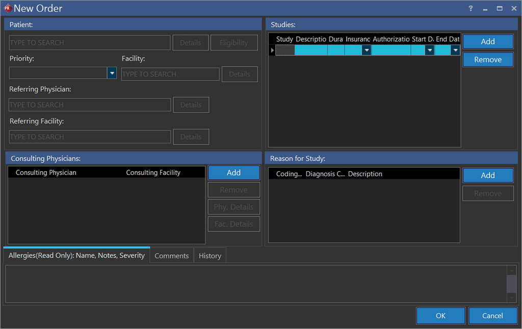 To create a new Order for an existing or new patient, a referring facility and study types must exist.