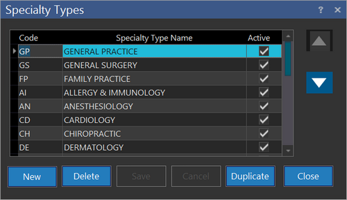 The order of physician specialties can be moved up/down in the list by clicking the or