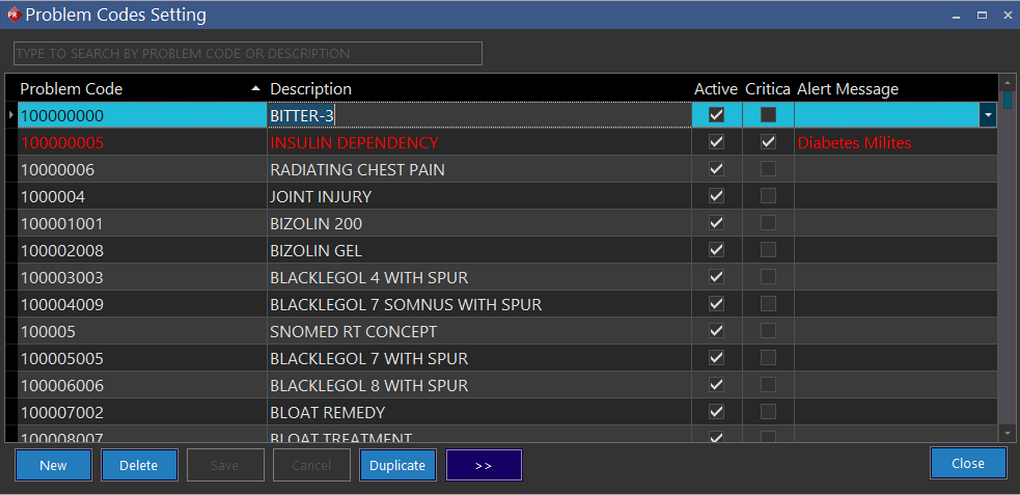 - The Problem Codes can be duplicated or deleted with the Duplicate and the Delete buttons available at the bottom of the form.
