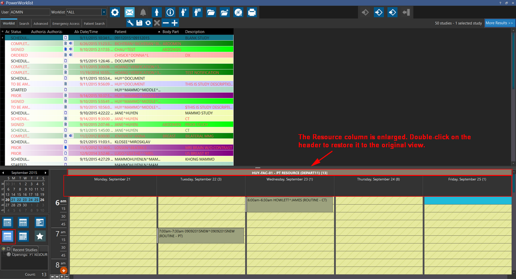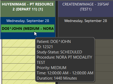 A third method for scheduling a study is by dragging them to the appropriate resource in the scheduler. For scheduling of a study, the resource's modality and the study's Scheduled Modality have to be the same. The study should be at the status of ORDERED (a status below SCHEDULED status). When you change an appointment date and time, the system automatically updates the Study date and time in the Study Info screen.