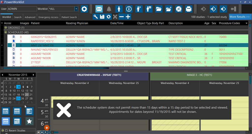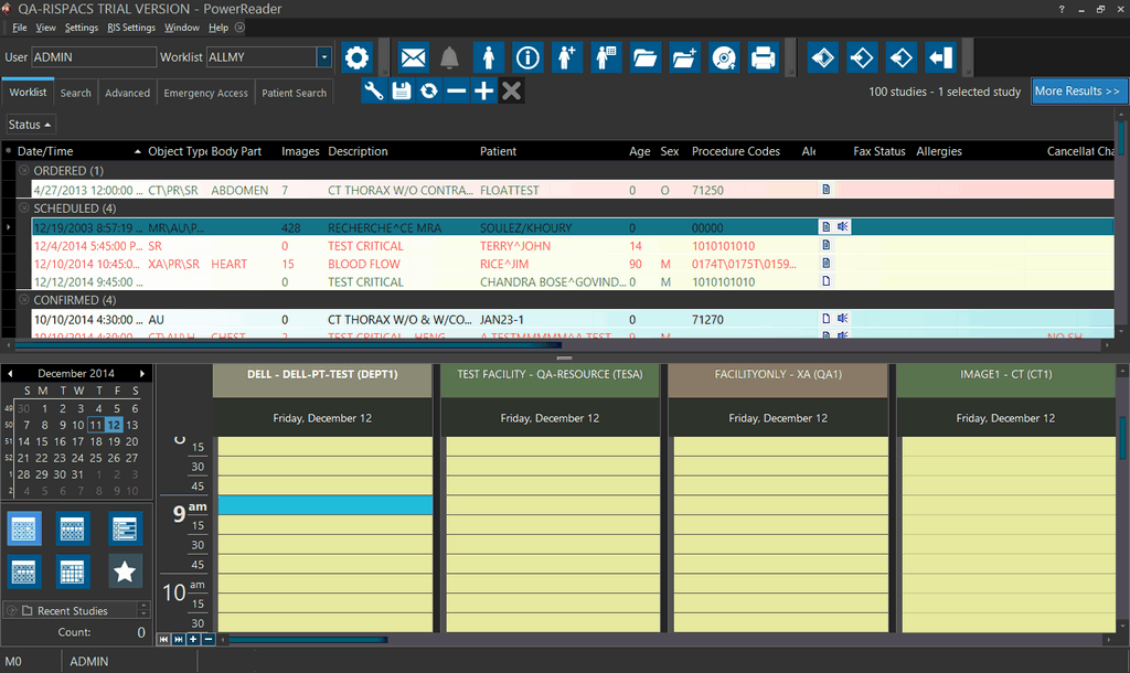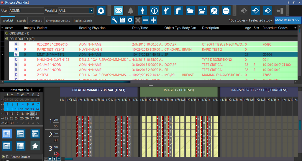 The Scheduler is used to keep track of the resources and their use. It is similar to a detailed calendar or planner where events (studies) can be listed at the appropriate time and date. When enabled, users are able to view and schedule studies in the facilities they are a part of. System Wide Administrators and users who are not bound to any facility will be able to view all facilities in the scheduler.