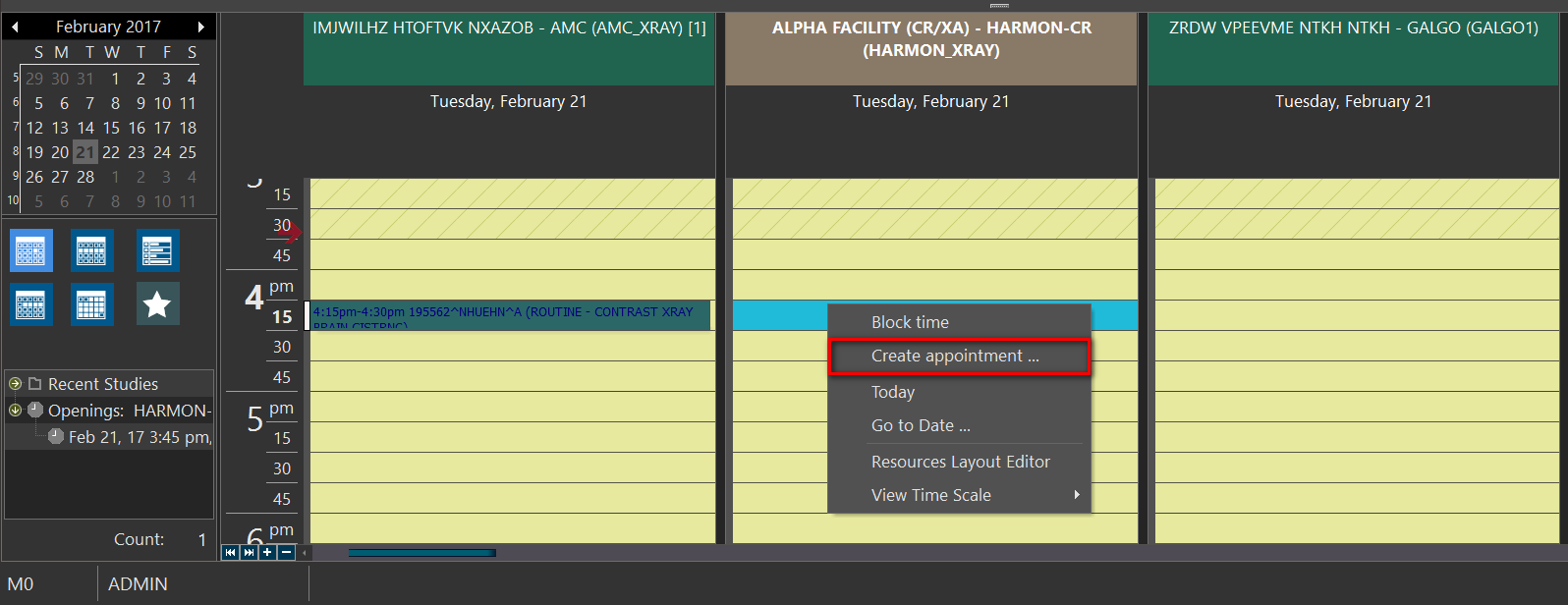 The various resources of a facility and their timings are determined in the Resources section of the Settings > Users and Facilities > Imaging Facilities tab. Right-clicking the mouse on an open time slot displays the following menu: