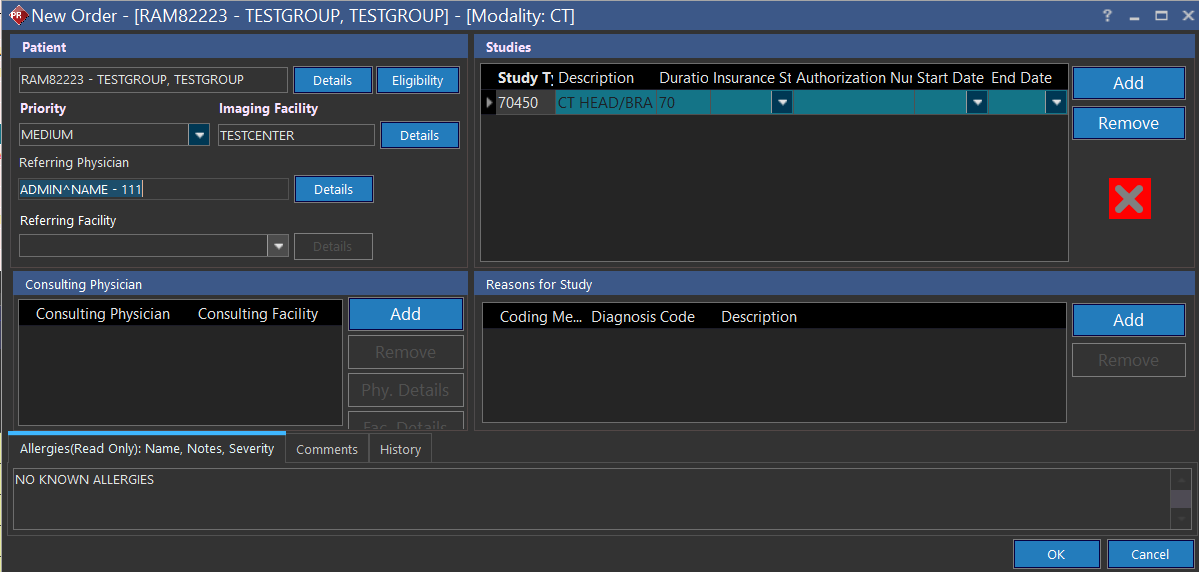 A list of Modalities of the Study Types is available at the top of the New Order form. Appointment for a desired patient can be scheduled by searching the patient in the Patient box. Entering data will create a meta-search which can be based on the patient's First name, Last name and Patient ID. Once a Patient is selected, the other Patient Information fields are populated. The Referring Physician, Study Type also should be filled in. The Allergies field is read-only and is created from Patient Info. Once the study is ready to be scheduled, the OK button is pressed. If a patient does not exist, clicking the New.. link in the meta search will launch the Patient Registration form. Hence the patient can be registered and an appointment created at the same time. The Referring Facility field allows input and selection only after entering a valid Referring Physician.