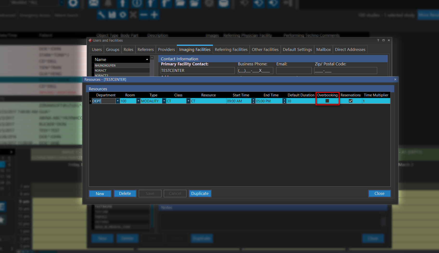 The Overbooking option allow a resource to be scheduled even when it has already been booked in that time slot, or is blocked in that time slot. To enable the Overbooking option for a resource, navigate to Users and Facilities: Imaging Facilities: Resources and click on the "Overbooking" checkbox.