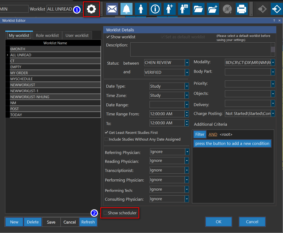 To display the Scheduler, click on the Worklist Settings icon and check the "Show Scheduler" option.