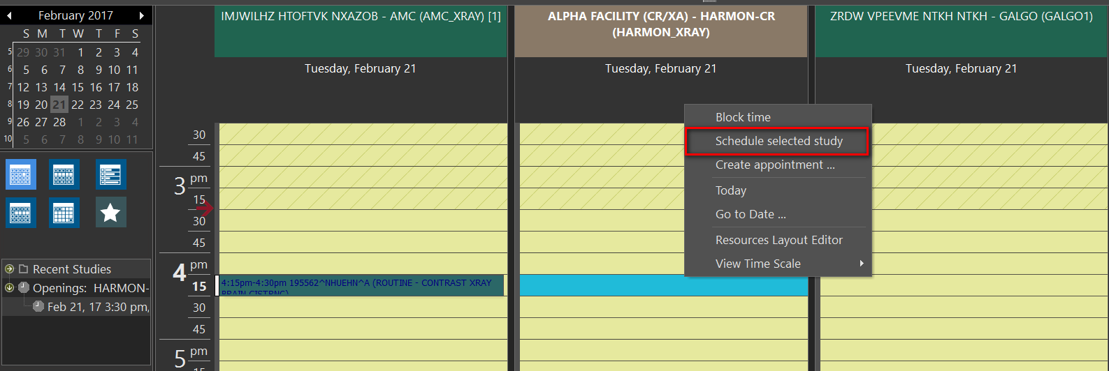 To schedule the study which has been currently highlighted in the Worklist, select the Schedule selected study option. This will automatically place the highlighted study in the desired time slot. This option is only visible if the modality of the scheduled study is the same as the one allowed for the resource.