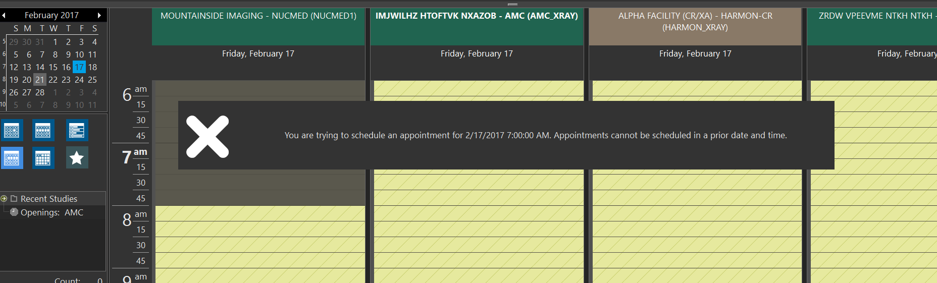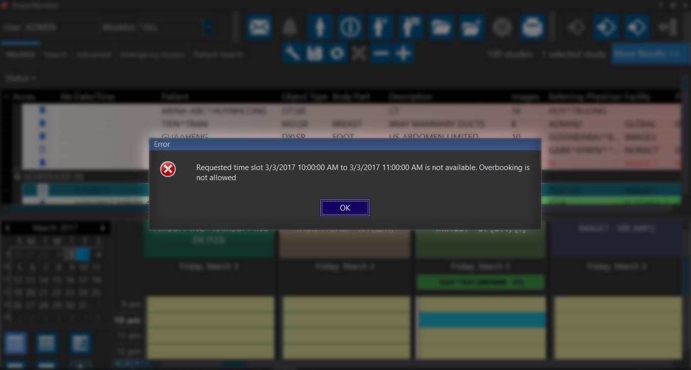 When you try scheduling a study for an appointment with a time slot extending to an existing appointment time slot, the system indicates the overlap with an X symbol marked in red colored box.