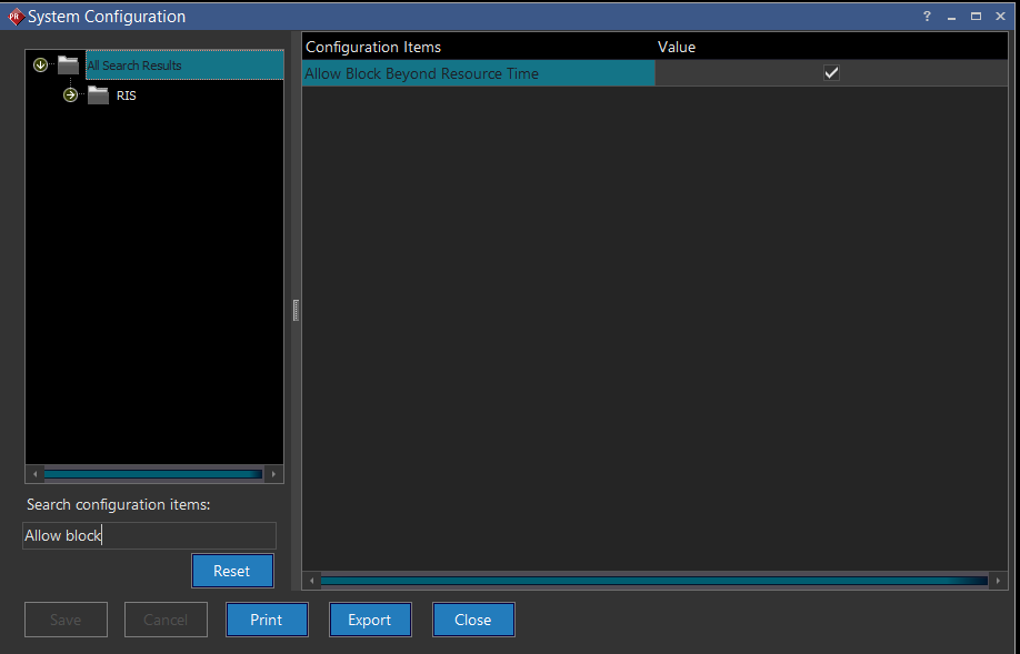 To add a blocked time slot beyond the time allowed for a resource (for example, to block time before the resource start time), select the configuration entry Allow block beyond resource time in System Configuration. This configuration entry is unchecked by default. This option is only available to users with Block Time privileges.