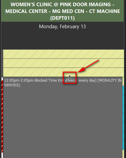 Dragging and resizing a blocked time slot can be used to modify its duration or move its desired time. To move the blocked time slot, click on the blocked time block and drag it. To resize a blocked time slot, drag the upper and / or lower bounds with the mouse to add or remove blocked time as shown below.