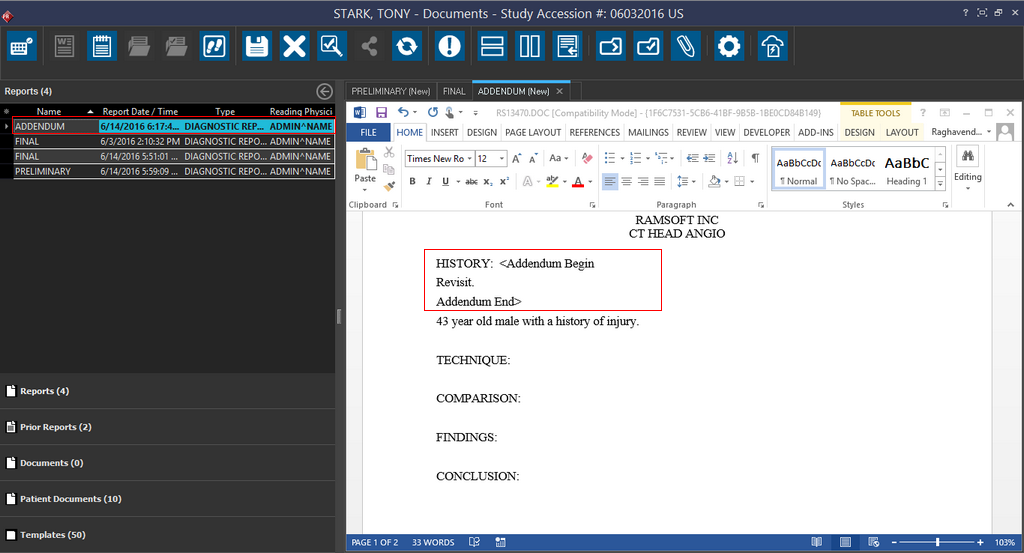 The Amend report option will attach an addendum to the final report and once the amendment has been saved, you can see that a Addendum report is generated with the Addendum section displaying the amendment.