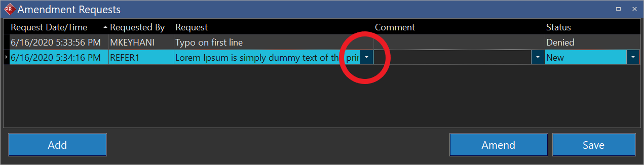 - The Amendment Requests dialog box appears displaying the amendment request notes. Note that request field could be expanded by clicking on the drop-down arrow (marked by a red circle on the following screenshot):