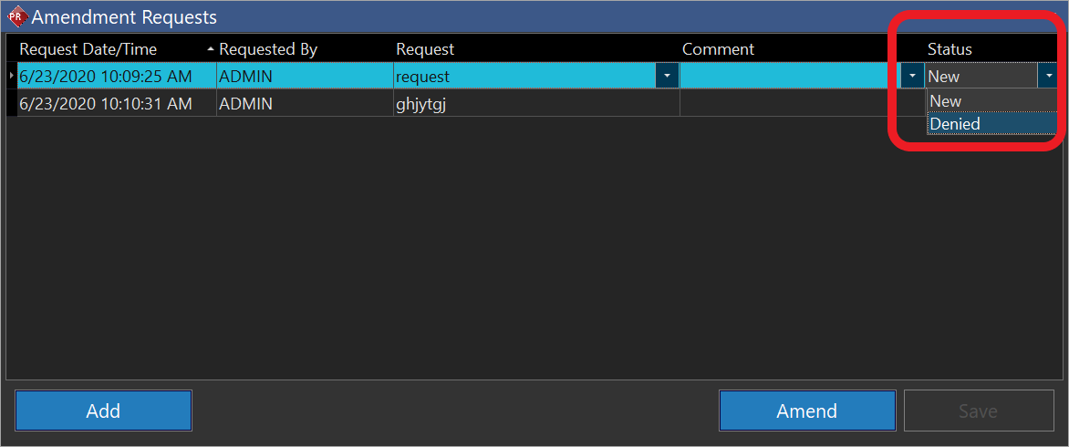 - Click the Add button to Add a Amendment request.