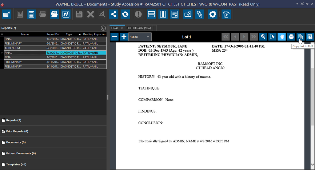 In PowerReader Document Viewer, you can copy text from diagnostic reports to your Electronic Health Record (EHR).