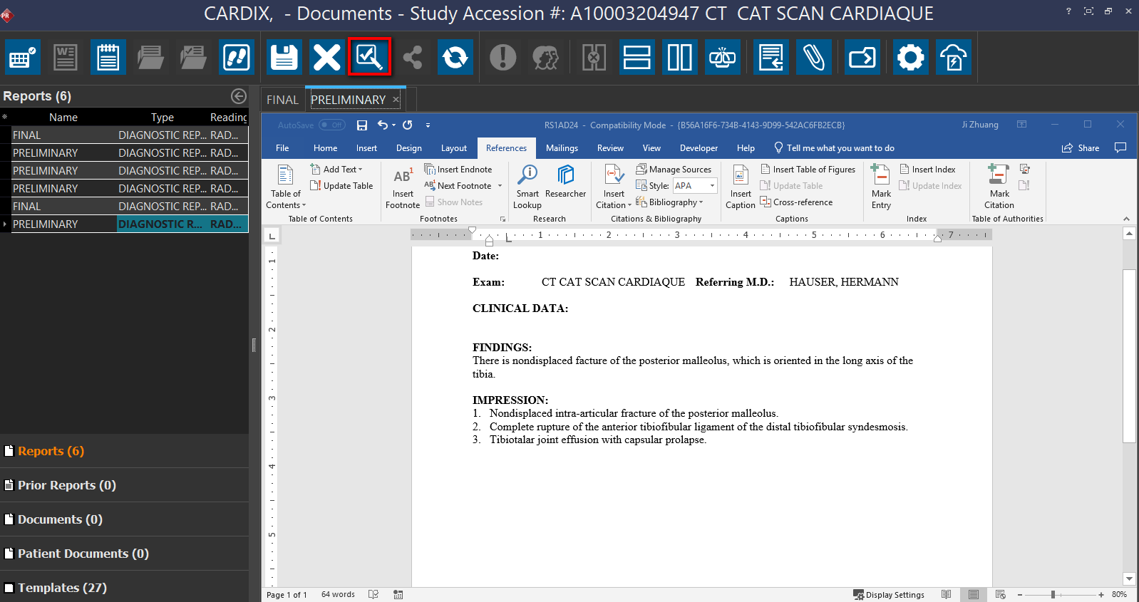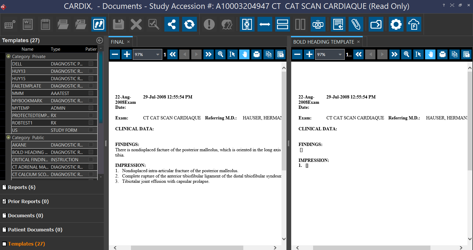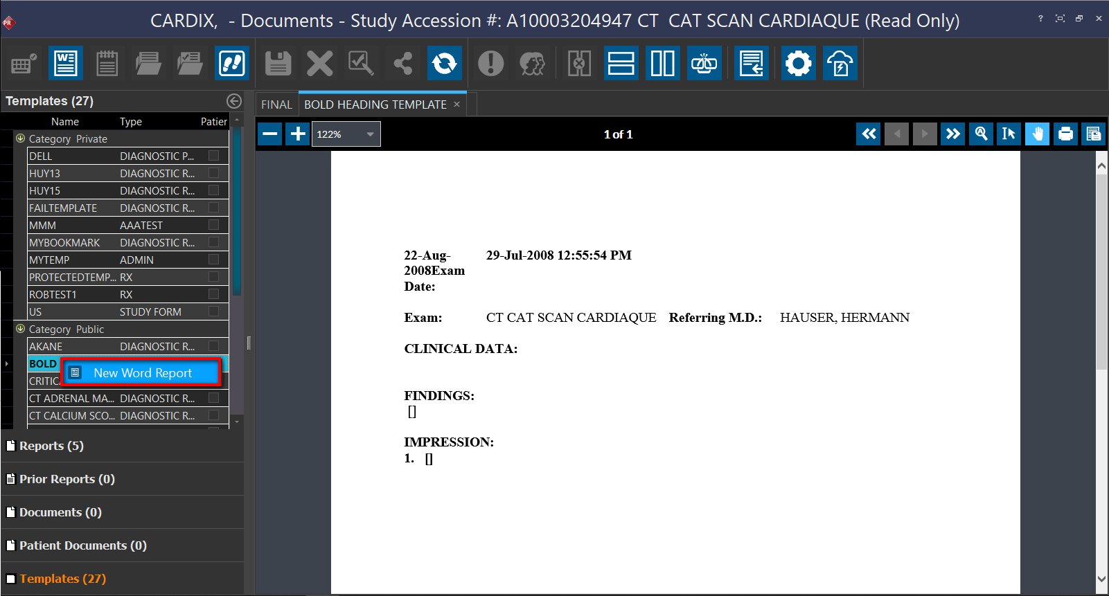 Open the Document Viewer either by clicking on the View/Create Documents icon after opening the study or by clicking on the Document icon in the Worklist or the Documents button in Study Info.