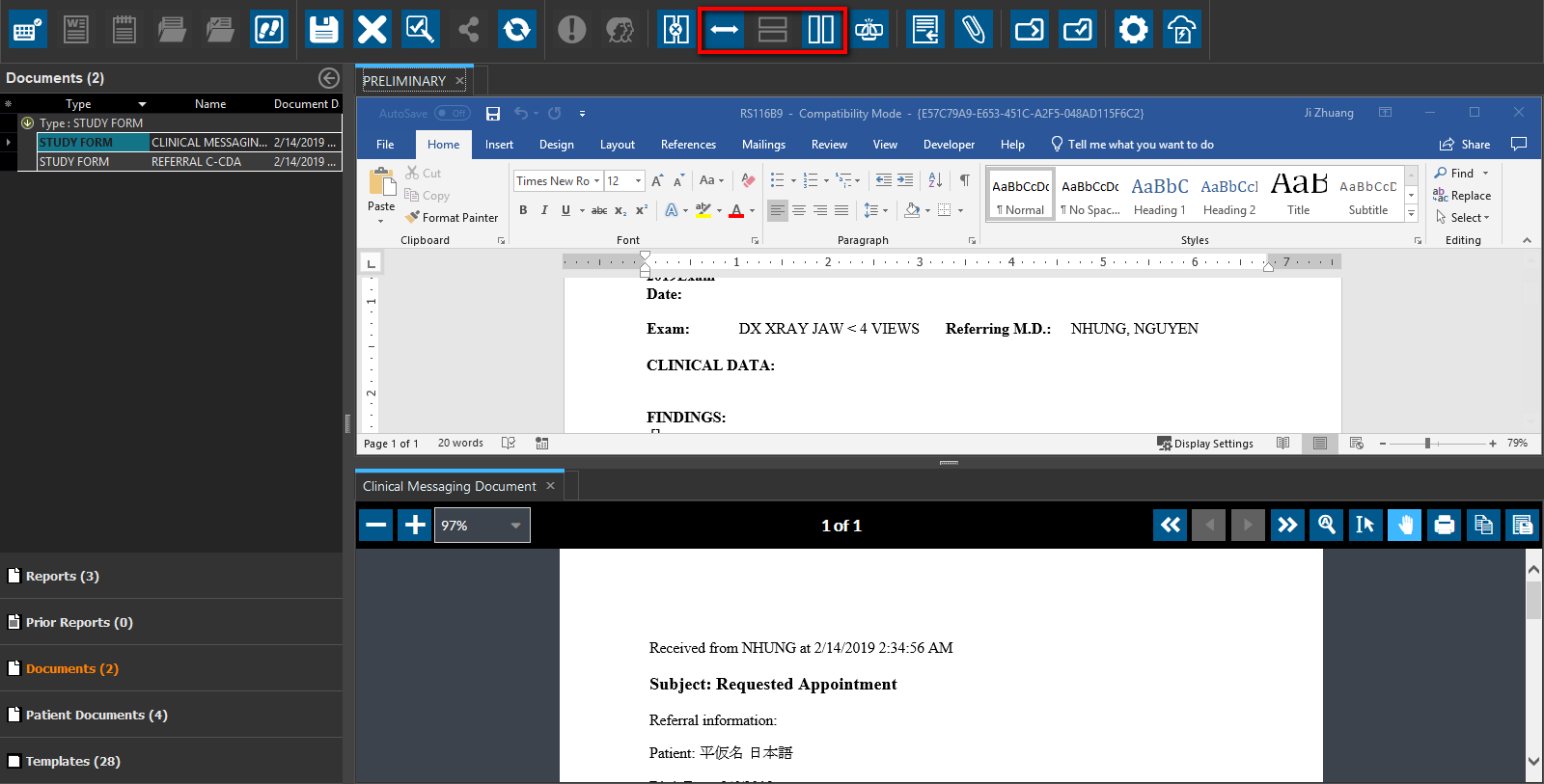 Selecting Horizontal Split will display the Report Viewer and Document Viewer in horizontal positions.