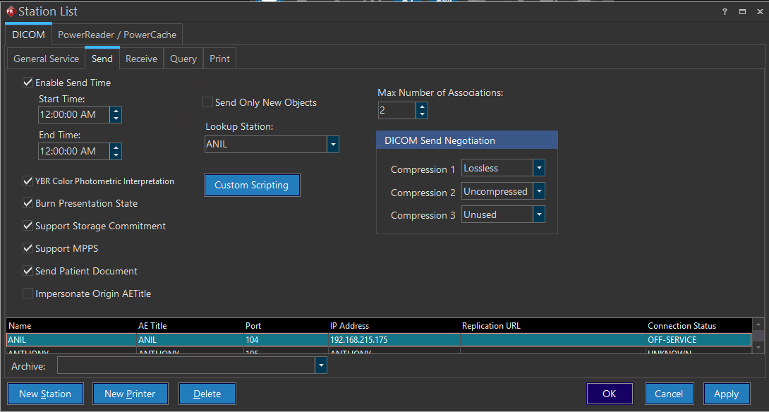 | Enable Send Time | The Enable Send Time option will create a time window during which studies will be sent. Any studies that are queued up for sending outside of that time window, will not go out until the Start Time is reached unless the priority of sending the study is MED or HIGH. Only studies with LOW priority that the Enable Send Time will be effective. Studies with MED or HIGH priority will still be sent outside the time window. This is useful for moving large amounts of data, to a destination such as an archive, during off hours. |