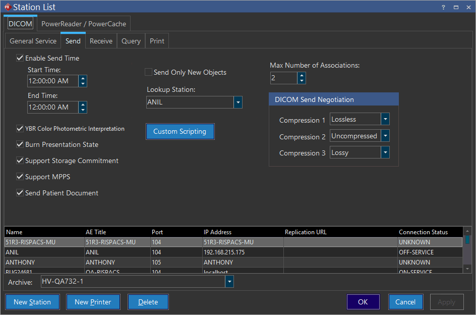 For PowerReader release PRU-8 or higher, the Station List consists of an additional Worklist Tab for inserting Custom Scripting. Custom Scripting in the Worklist tab allows for customizations of DICOM Modality Worklist and regular C-FIND request datasets.