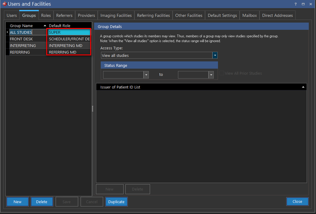 The Status Range section defines the statuses that the user is able to see. In the example above, the READING group of PERFORMING MD, allows its members to access their own studies that they have been associated with and are between the status ranges ORDERED and READ.