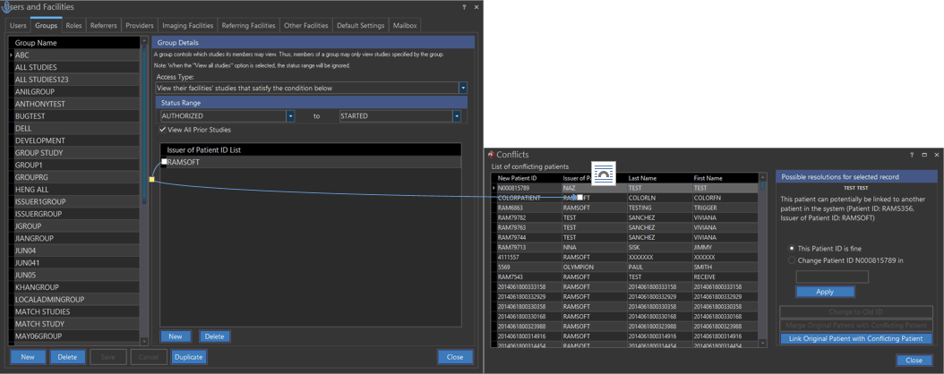 System-wide Administrators can see all the conflict studies in the system. If the Issuer of Patient ID of a conflict study has been defined in the "Issuer of Patient ID List" of a Group, then members of that group will be able to see that conflict study. If the conflict study belongs to an imaging facility which the logged in user is a member of, the user will be able to see the conflict. If the user is not a member of that imaging facility, he will not be able to see the conflict study.