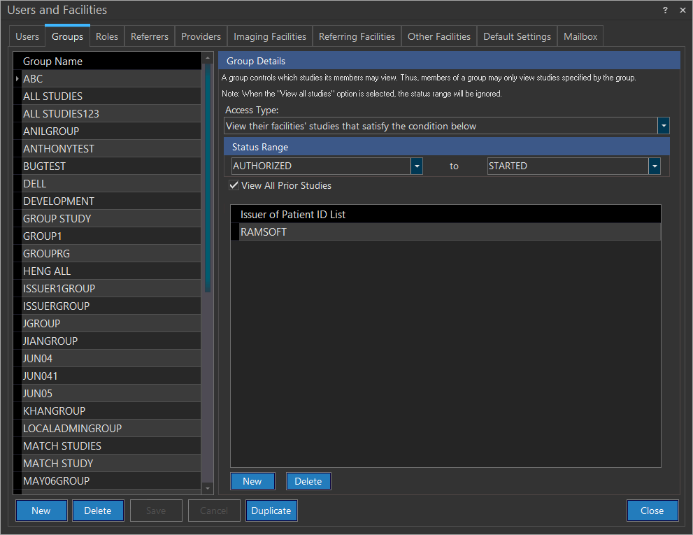 | View studies that satisfy conditions below | Provides the user access to all studies within the system as long as they fall within the selected Status Range and have the same Issuer of Patient ID and contains at least one facility (Imaging, Referring, Reading, or Performing) the user would access. |