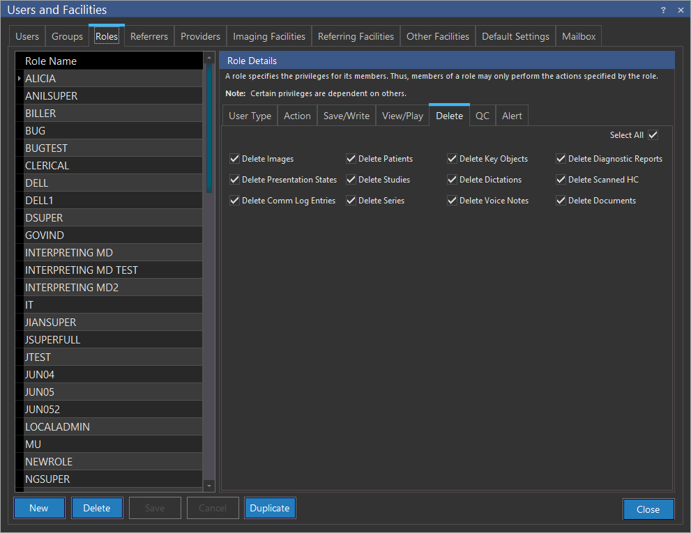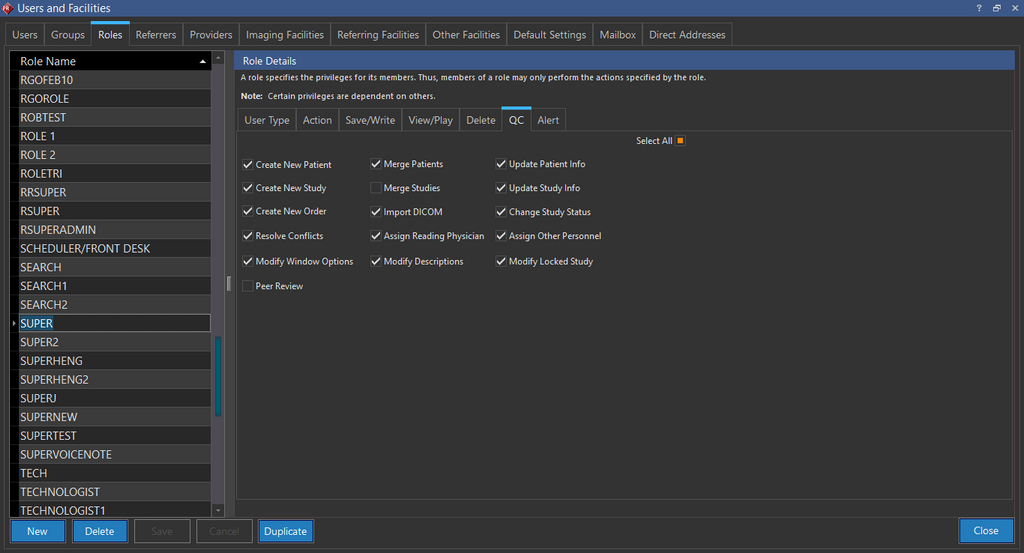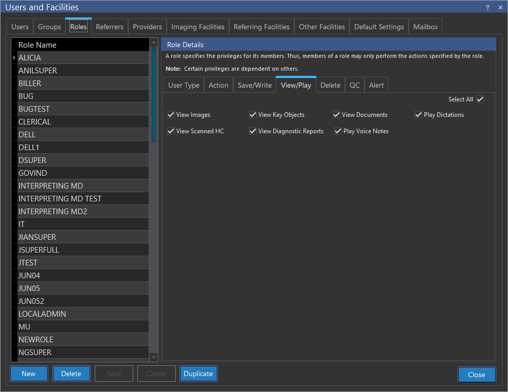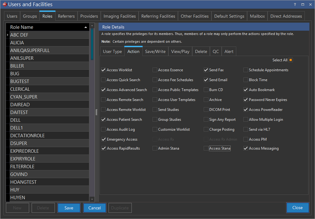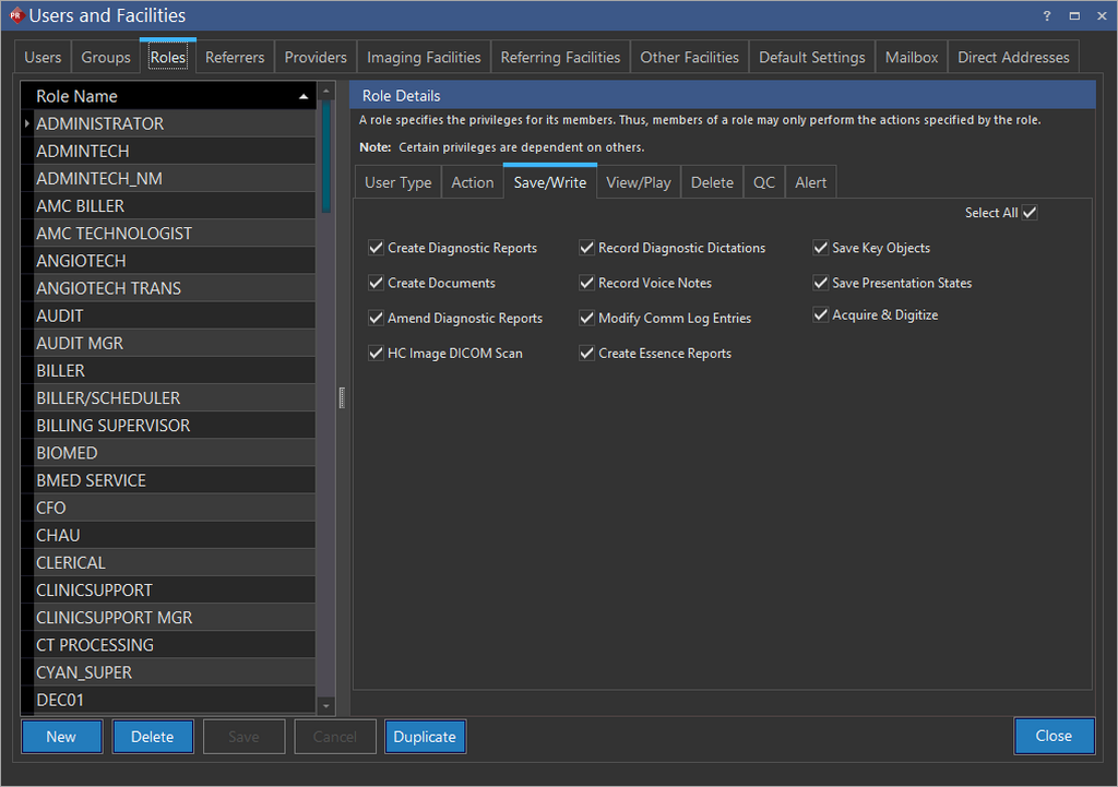 Role membership determine the available actions (privileges) a user has on the system. It is recommended that roles are based on the profession of the system users (e.g. radiologist, technologist, etc.), as these usually determine what functions the user will be performing on the system. Each RamSoft system comes with a number of pre-configured roles based on the general tasks performed by users at medical facilities. These defaults may suit your installation, they may need the addition or removal of one or more privileges, or they may be unsuitable for the facility. Either way, they are a good initial starting point when creating new roles.