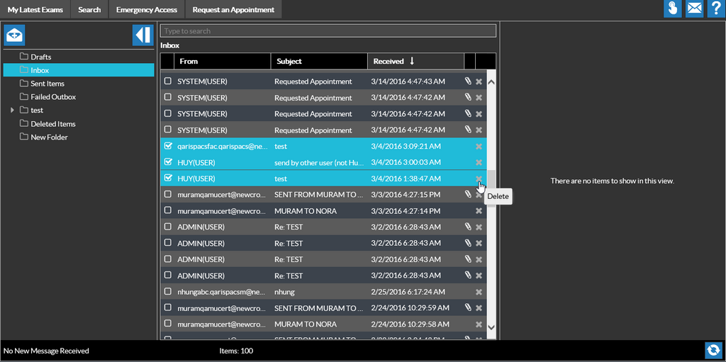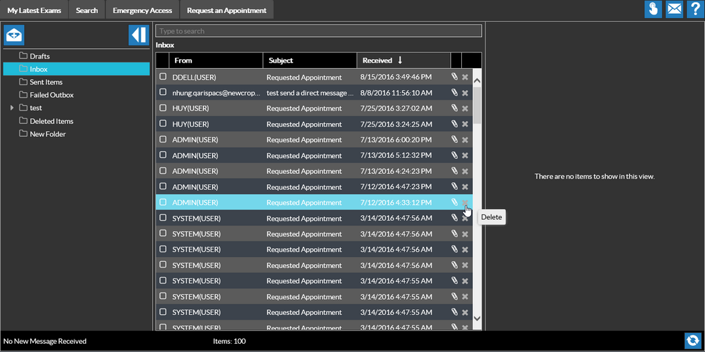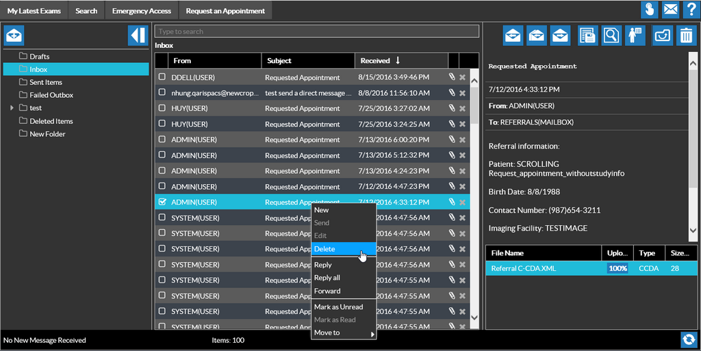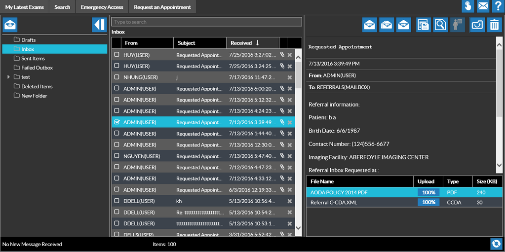 Inbox: Displays the messages received from local users as wells as external sources who have direct addresses. Messages showing the referral requests (waiting to be converted to appointments) sent by Referring Physicians are also listed in the Inbox. At any point of time, the Inbox shows a balloon with the number of un read messages besides the Inbox folder. Direct messages through auto distribution are set to read status by default.