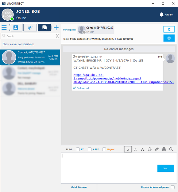 Download, install and launch the qliqCONNECT application on the desktop or phone to view received messages. An example of a message in the qliqCONNECT application sent by a QliqSOFT Member is displayed below: