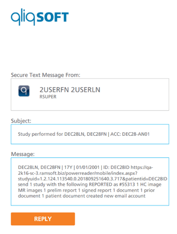 Within the sample message above is a RapidResults link to the study the message is regarding. The link displays the study with only images and the latest signed report. Deprecated reports, patient/study documents, and comparison studies are not visible.