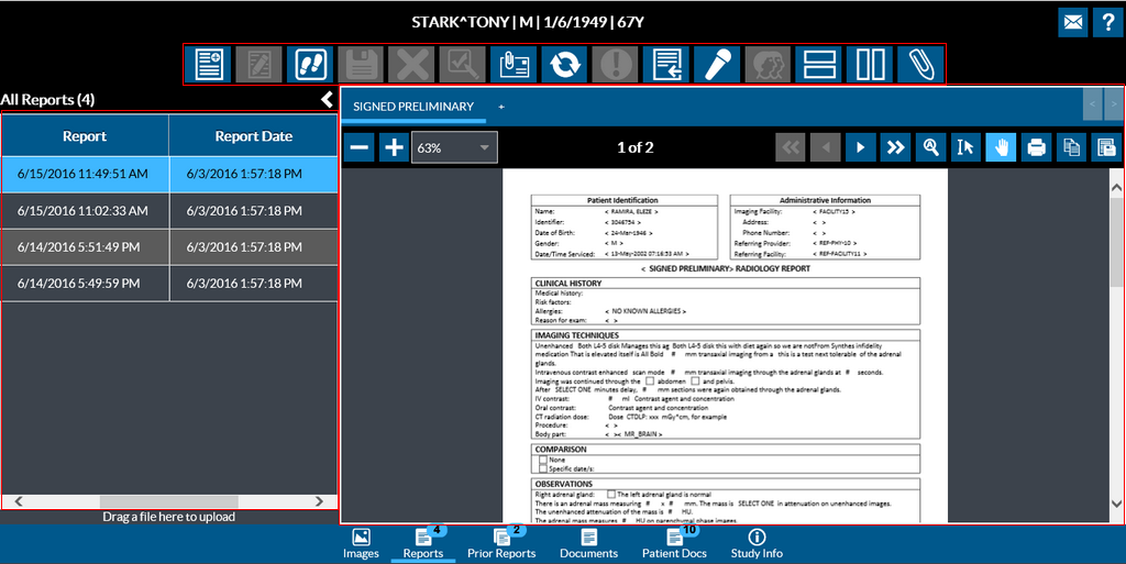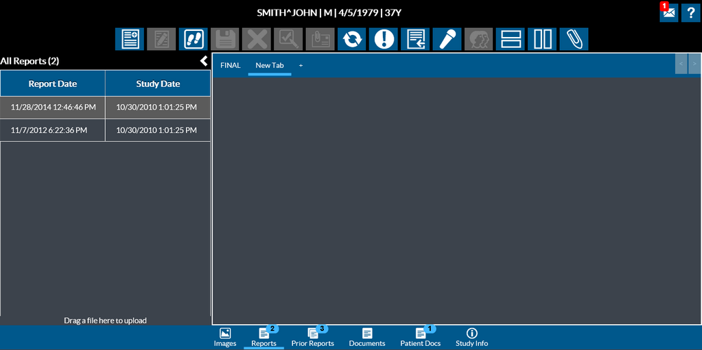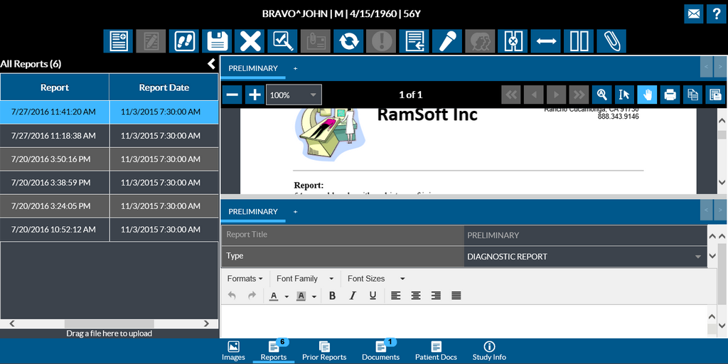 The Document List panel on the left, lists all the reports or documents along with the report creation date and time. You can drag any files here to upload or attach them to a study.