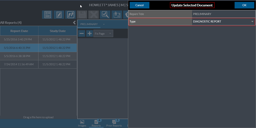 When you try to update a selected document, you can see that Update Selected Document form appears displaying the Report Title and Type.