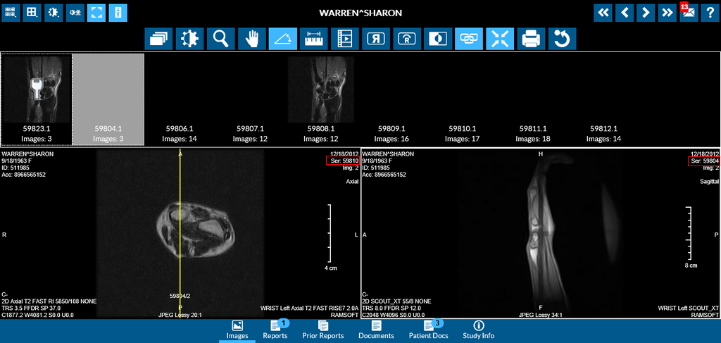 The Linking tool links images across the currently visible series that are in the same plane and additionally links the slice positions as well. Scrolling through any one of the series will result in the linked series scrolling along with it. Furthermore, if the linked series do not have the same number of images, scrolling will be performed on selected viewport images and all the linked viewports by synchronizing the images based on the position relative to the current slice of the selected viewport. In this way the system will automatically determine the scrolling intervals in order to always display the images that are related to the closest image based on location.