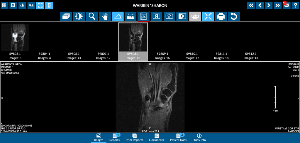 The Cine tool can be used to view studies such as Ultrasound in real time. It can also be used to quickly scroll through a large series of images without having to manually click the mouse buttons. This feature is accessible through the Viewing Tools toolbar. The tool is available if the study contains more than one image.